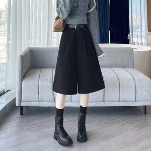 2025秋冬日系复古加厚深灰色毛呢七分裤子新款小个子简约气质靴裤