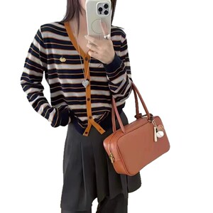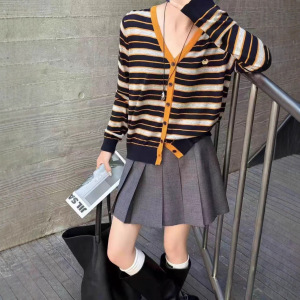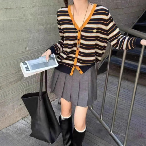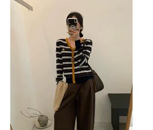 2025秋季新款韩版宽松显瘦百搭V领长袖针织衫女毛衣上衣条纹开衫