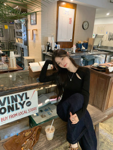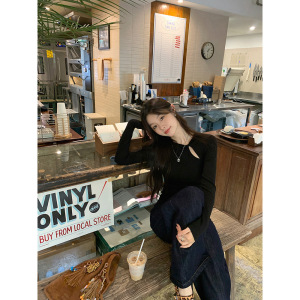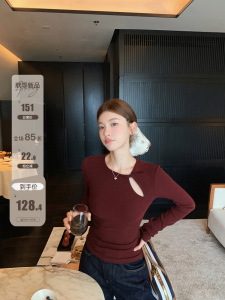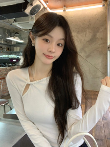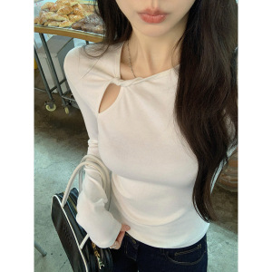 张贝贝ibell长绒棉混纺扭结镂空甜欲针织T不规则圆领修身长袖上衣