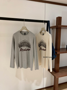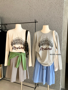 WGWE秋季美式复古皇冠印花软糯休闲百搭宽松显瘦圆领长袖T恤W7234