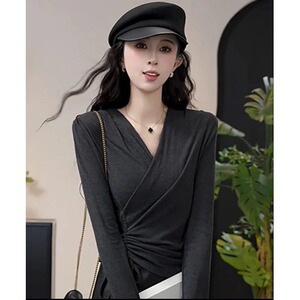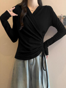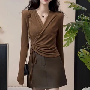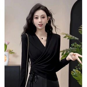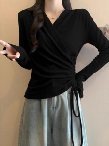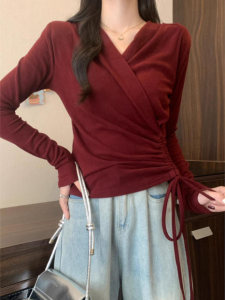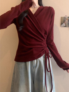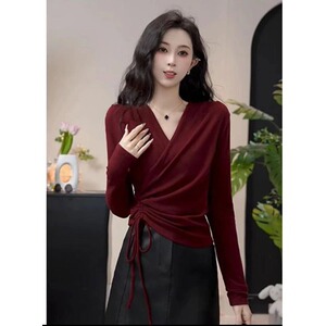 安可拉红V领正肩长袖T恤女秋装大码胖mm打底衫不规则抽绳收腰上衣