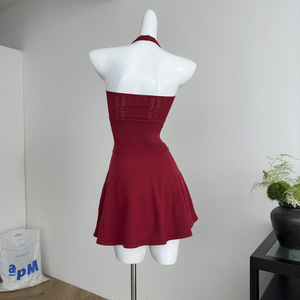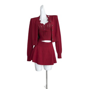 红色钩花羊毛针织开衫挂脖背心/半身裙套装三件套2025秋季新款