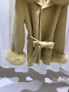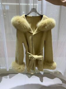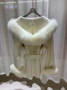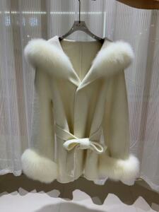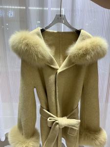 秋冬新款双面羊毛呢连帽款系带狐狸毛大衣外套女中长款洋风