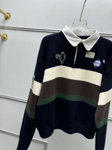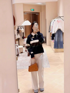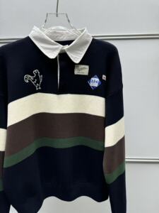南油法式polo衫毛衣长袖女复古拼色刺绣橄榄秋翻领宽松休闲针织衫
