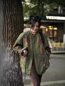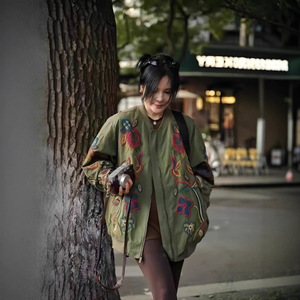 大爆款小众设计重磅刺绣高端欧美风拉链风衣外套女军绿色百搭显瘦
