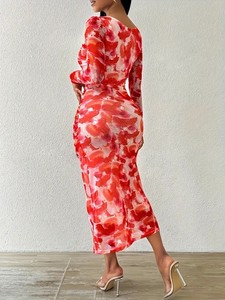 亚马逊欧美跨境2025春秋新款印花圆领法式高腰连衣裙优雅气质长裙