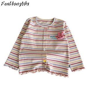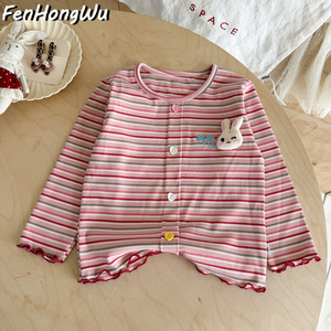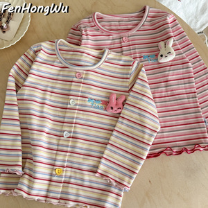 【粉红屋】甜美木耳边时尚长袖上衣条纹可爱兔子女童打底衫跨境