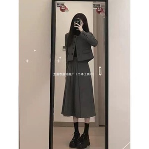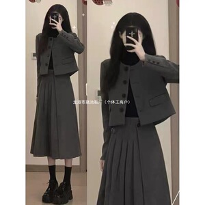 美式复古灰色学院风毛呢西装百褶裙套装女秋冬季小香风长裙两件套