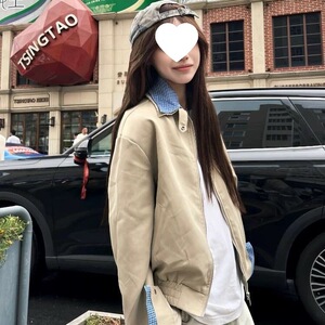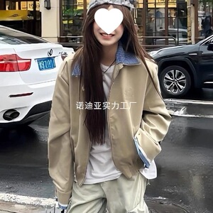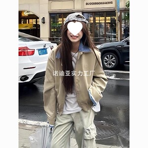 美式复古格子拼接假两件外套女秋季新款男女款休闲工装夹克上衣潮