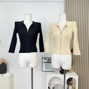 老钱频道米杏色拉链坑条开衫修身翻领短款针织上衣