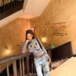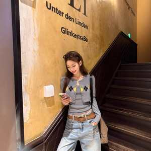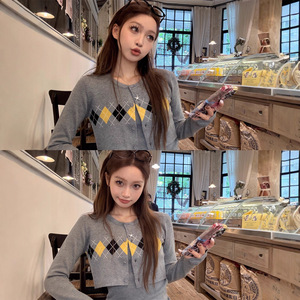 实拍 学院风小众撞色菱格纹针织开衫修身显瘦短款吊带两件套89384