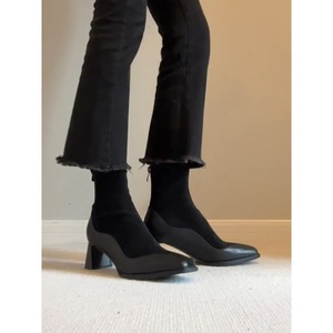 牛皮版~法式真皮弹力瘦瘦靴女复古方头拼接袜靴高跟靴子气质短靴