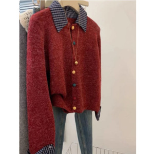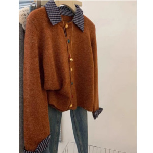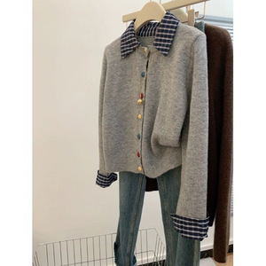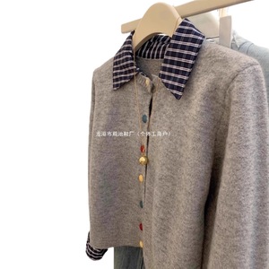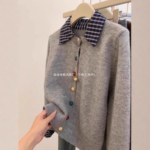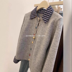 灰色假两件设计衬衫拼接针织开衫毛衣外套女小个子短款彩色扣上衣