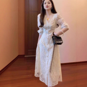 时尚蕾丝连衣裙秋装2025新款法式温柔风v领长袖气质显瘦仙女长裙