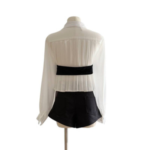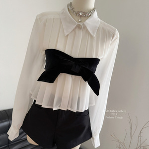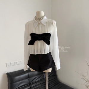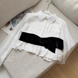 塞纳法式浪漫复古泡泡袖蝴蝶结风琴褶皱设计白色衬衫短上衣