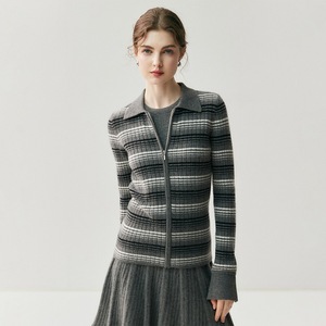 山羊绒女式POLO衫秋冬新款拉链开衫间色条纹简约设计修身显瘦外套