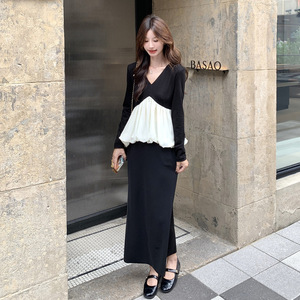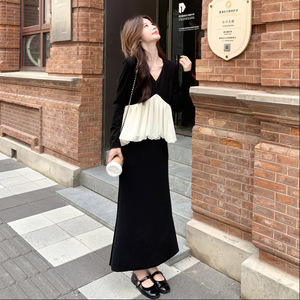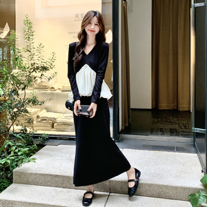 实拍小香风撞色拼接V领上衣半身裙套装2025秋时尚甜美显瘦两件套