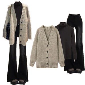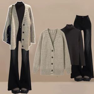 早秋一整套穿搭女2025新款高领打底衫百搭毛衣开衫牛仔裤三件套潮