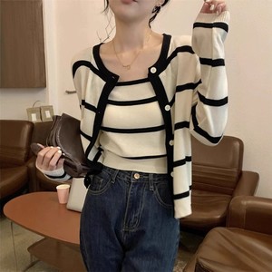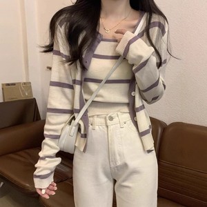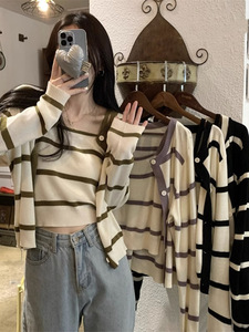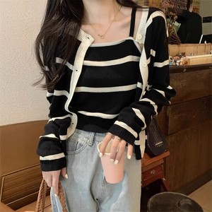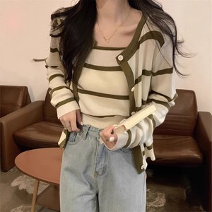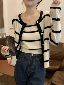 别致漂亮条纹长袖针织开衫套装女秋季毛衣外套上衣吊带背心两件套