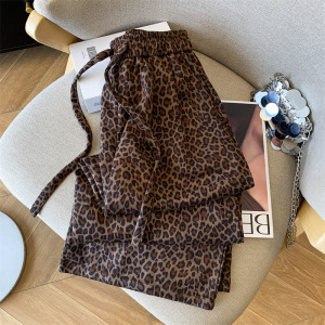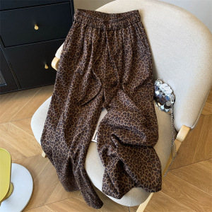 美拉德豹纹阔腿裤女秋季新款松紧腰宽松休闲裤复古咖色直筒拖地裤