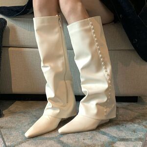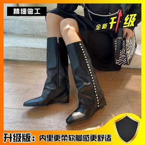 显腿瘦!白色裤管靴2025新款网红胖mm尖头坡跟高筒不过膝长筒靴女