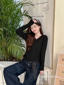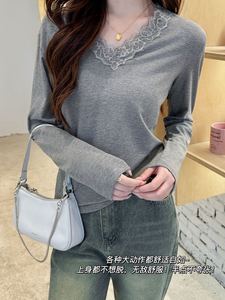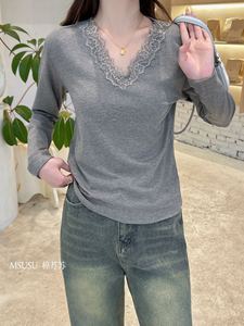 MSUSU棉苏苏2580#V领蕾丝花边打底衫简约修身纯欲风显瘦长袖T恤秋