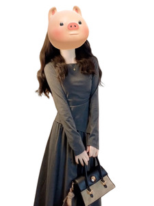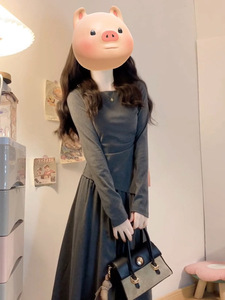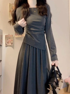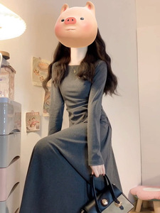 小个子早秋氛围感穿搭灰色连衣裙子女秋季新款收腰显瘦高级感长裙