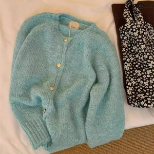 小香风金属扣蓝色圆领针织开衫女秋冬慵懒风软糯毛衣外套宽松上衣
