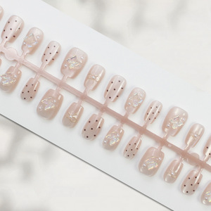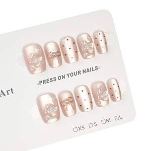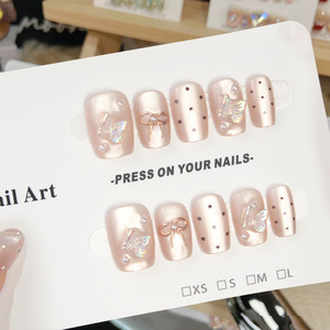 X451法式波点秋冬鎏金蝴蝶结立体裸色猫眼手工封层贴片可拆穿戴甲