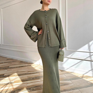 欧美跨境女装2025秋季新款圆领长针织毛衣裙开衫纽扣长袖外套两件