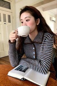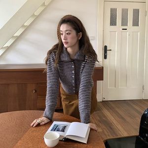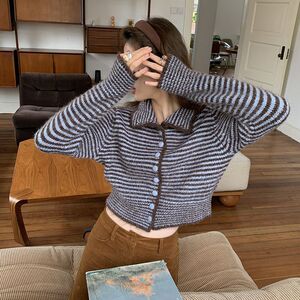 25新款韩系复古松弛感撞色条纹翻领毛衣外套女秋冬款短款叠穿chic