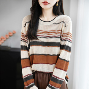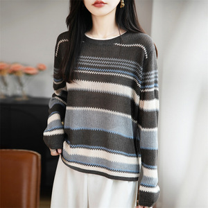 2025年早秋新款精纺羊毛圆领针织衫长袖女镂空拼色宽松套头打底衫
