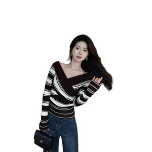 设计感撞色条纹一字肩针织衫女秋季新款法式气质修身显瘦毛衣上衣