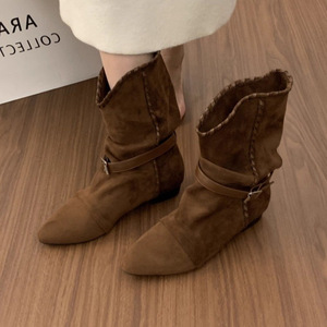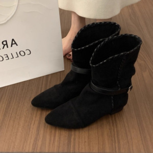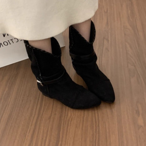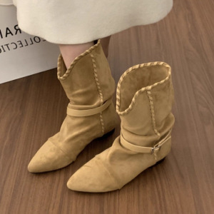 复古磨砂皮尖头褶皱堆堆靴子2025新款单靴内增高短筒西部牛仔靴女