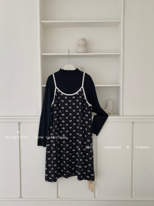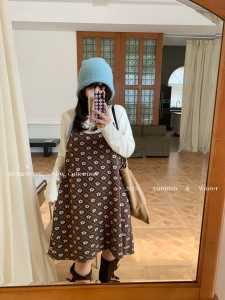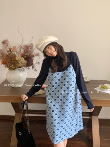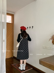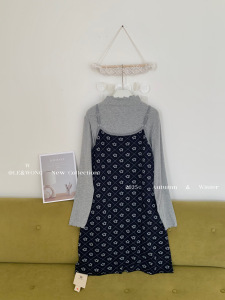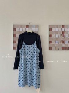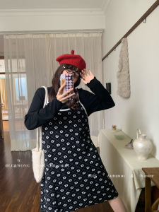 W家秋新款套装女显瘦穿搭复古菱形格花朵吊带裙长袖针织t恤两件套