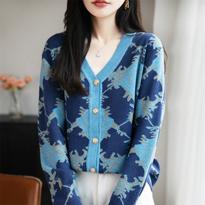 25年早秋新款精纺羊毛V领针织开衫长袖女设计感提花宽松上衣外套