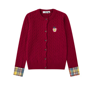 Fudge Pink 25冬季New甜美少女格纹拼接针织毛衣开衫