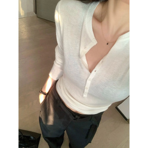 轻熟气质白色v领长袖针织开衫女春秋季单排扣超好看时髦松弛上衣