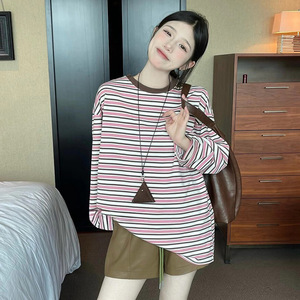 LEENKU秋季新款洗水棉宽松上衣复古风洋气时髦撞色条纹长袖T恤女