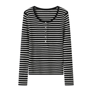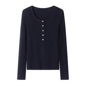 2025秋新款时尚百搭修身显瘦圆领半纽扣套头长袖T恤针织衫上衣女