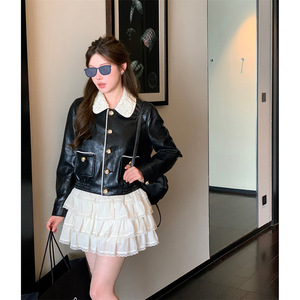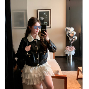 杨小卷 miu系千金风娃娃领环保皮衣女短款夹克小香外套小个子穿搭