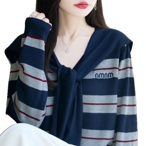 法式撞色条纹两件套带披肩针织开衫女外套毛衣宽松设计感女装上衣