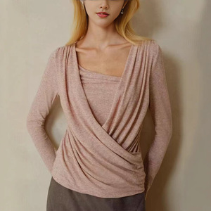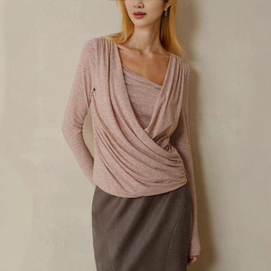 someone sometime苎麻混纺假两件立体剪裁交叉褶皱荡领针织上衣