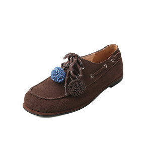 可爱女人毛绒球牛反绒面系带小皮鞋2025舒适平底宽松真皮休闲单鞋
