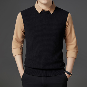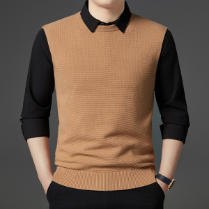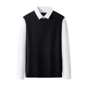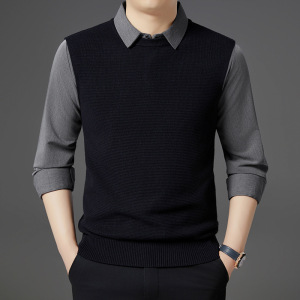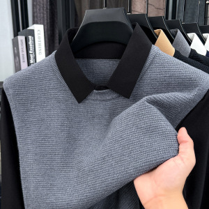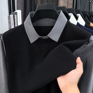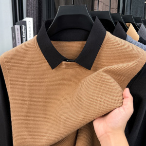 跨境针织男士假两件2025秋季新款时尚拼接翻领撞色毛衣男针织衫