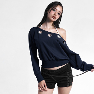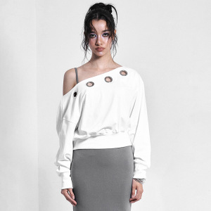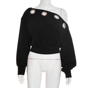 Y25TP379欧美女装秋冬季亚马逊新款斜跨露肩鸡眼镂空橡筋收腰上衣