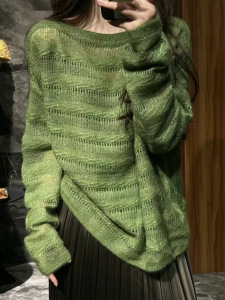 早秋巨好看流行韩系穿搭松弛感绿色宽松针织上衣慵懒风高级感毛衣