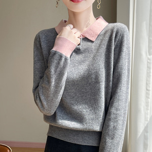 2025年秋冬新款纯羊毛Polo领针织衫长袖女拼色软糯保暖套头打底衫