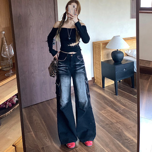 美式黑色多口袋工装牛仔裤女春秋款宽松阔腿高腰显瘦直筒拖地裤子