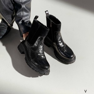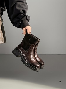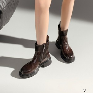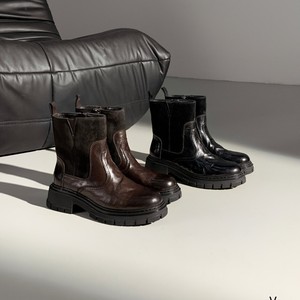 欧洲站女鞋25冬软手抓纹胎牛皮拼羊猄皮圆头舒适侧拉链切尔西短靴